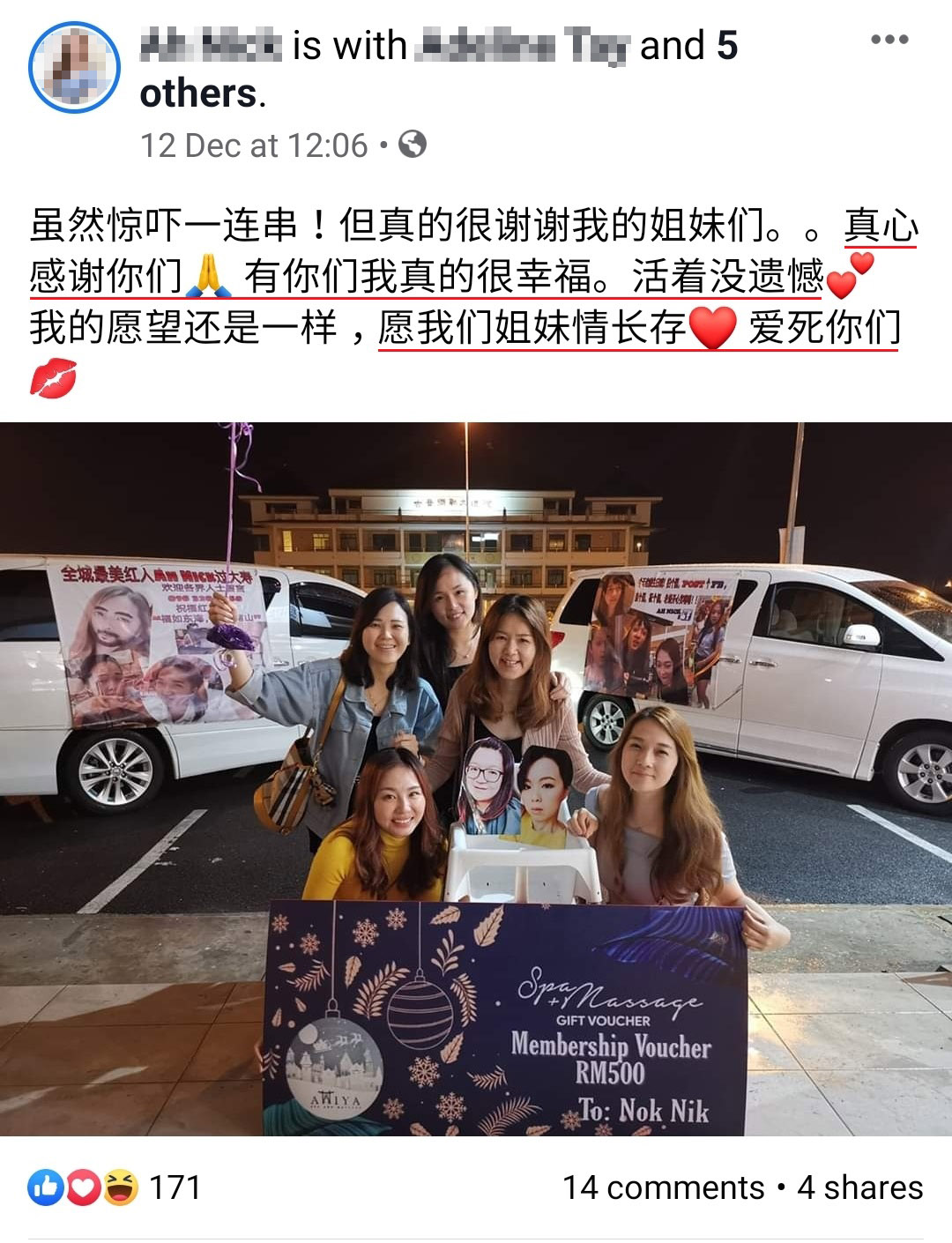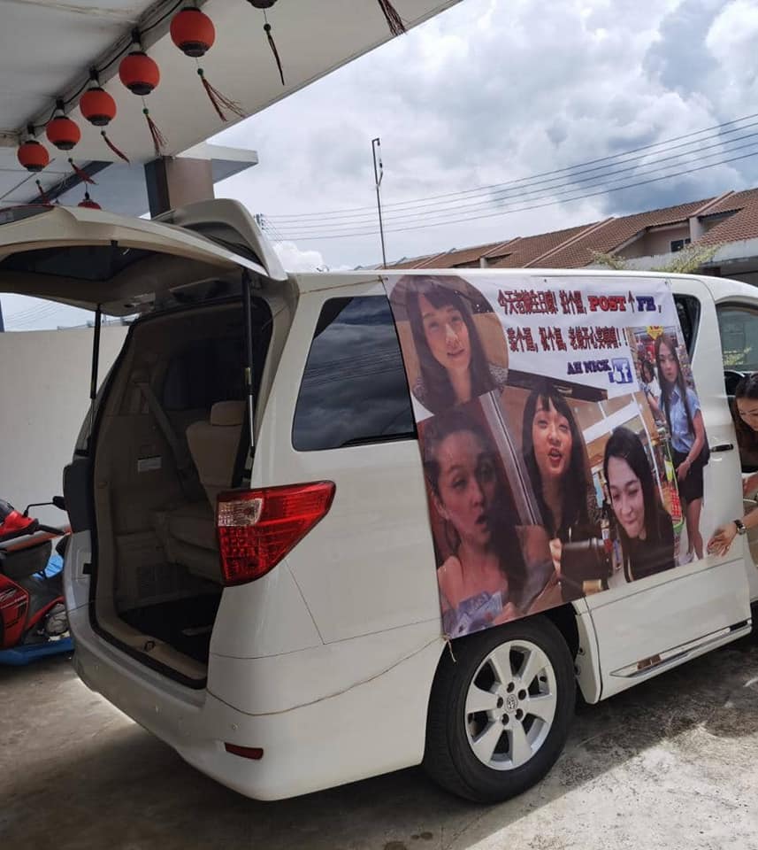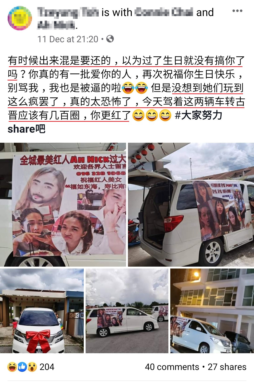 你以为这样就结束了吗?!不!没想到隔天的生日惊喜更劲爆!闺蜜们为 Nick 定做了布条,贴在车子的外面,让她红遍古晋整座城!