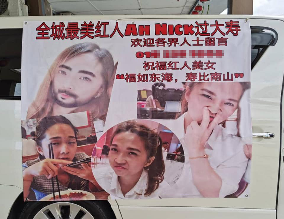 ▼ 厉害的来啦!布条上满满的都是 Nick 的丑照,还写着:「全城最美红人 Ah Nick 过大寿!」