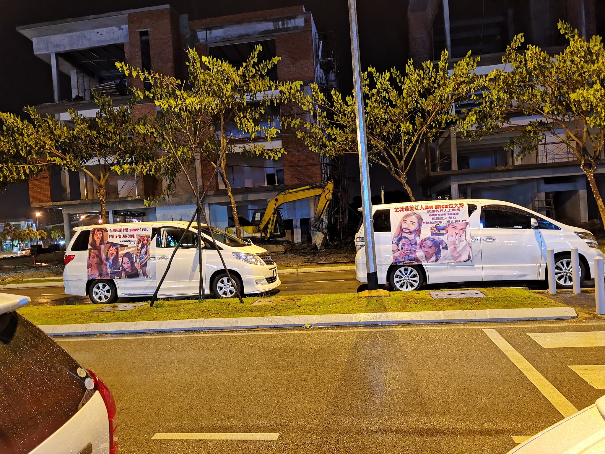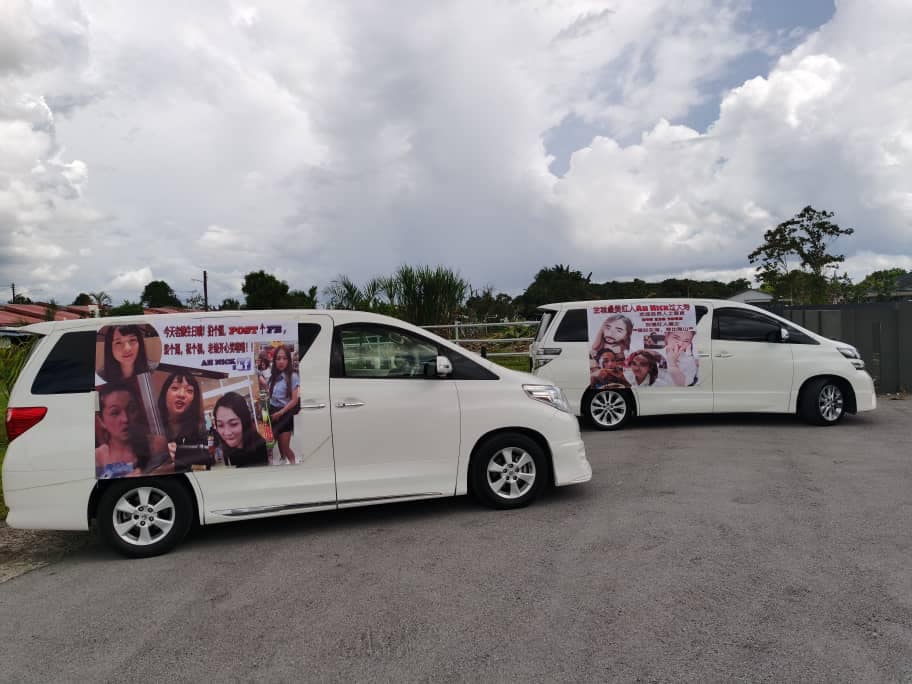 ▼ 两辆白色 Toyota Alphard 贴上不同的布条,准备就绪!