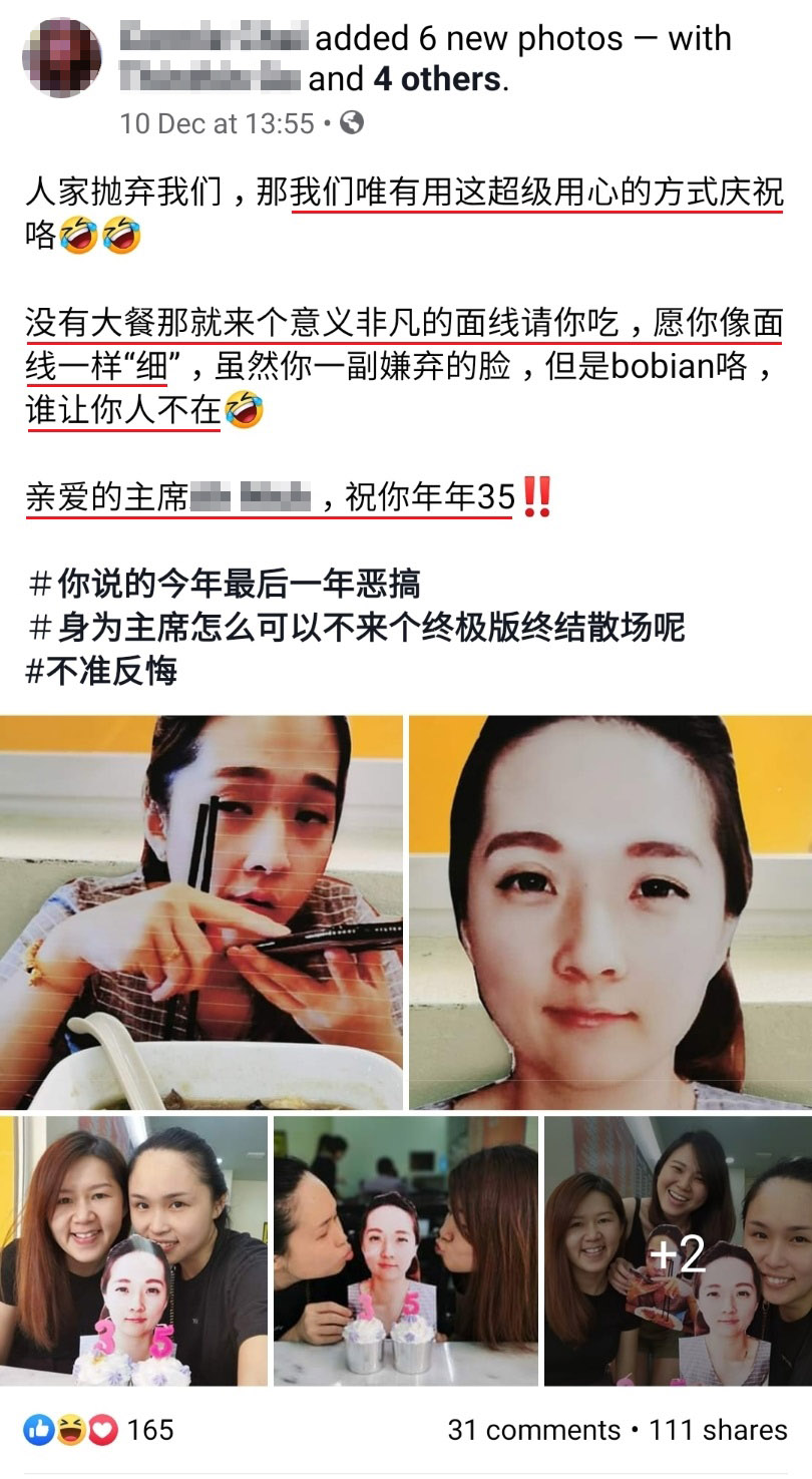 这群好闺蜜来自砂拉越古晋。由于寿星 Nick 在生日当天不在,闺蜜们就只好这样为她庆生啦~
