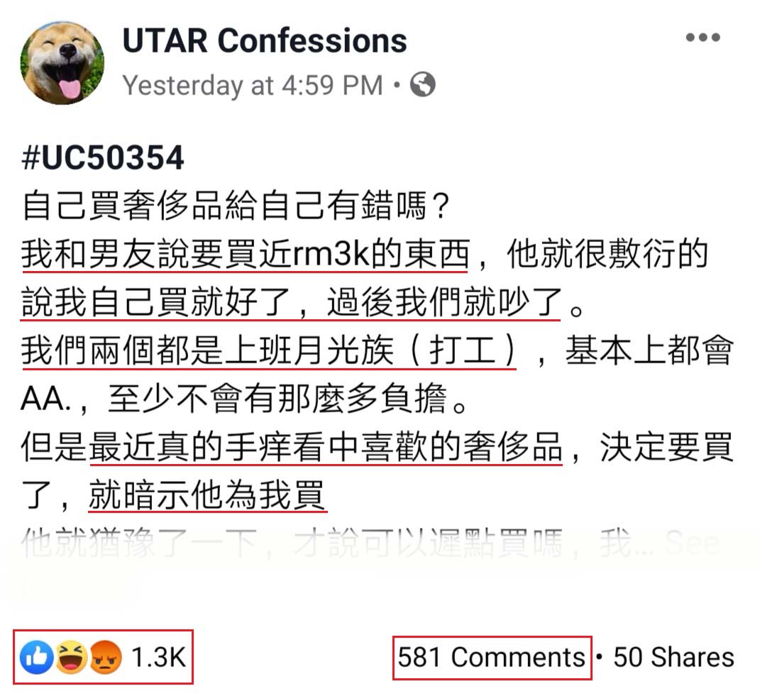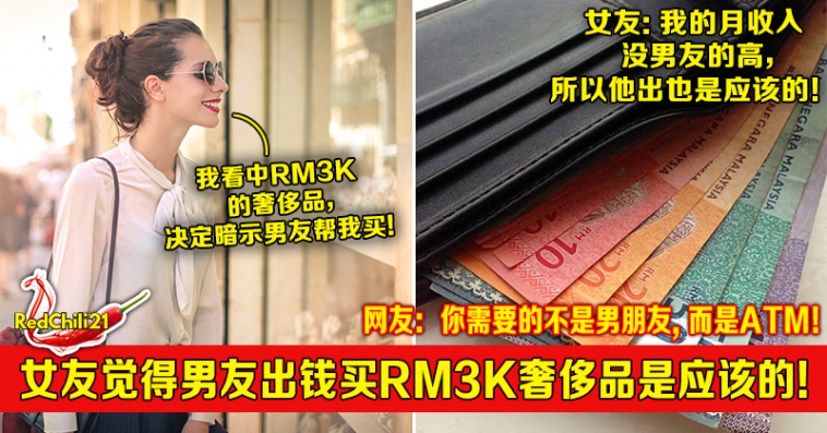 一名女友发出帖文说道「自己看中一件价值RM3K的奢侈品并决定要暗示男友帮她买」!因自己的收入不高过于男友,所以觉得男友出钱是应该的!
