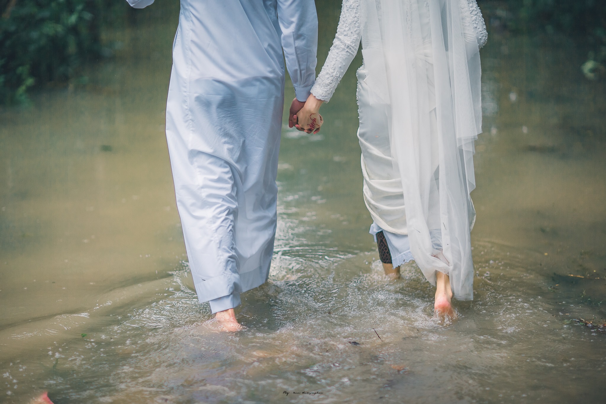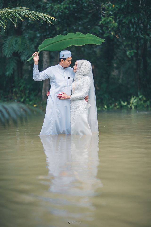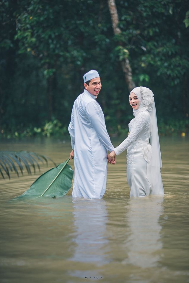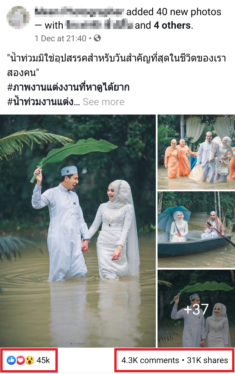 来自泰国南部的一名摄影师—— Meen Photographer 在面子书分享一对新婚夫妇穿着结婚礼服在水中的照片,并写道:「生命中最重要的日子,洪水对我们两人来说不是阻碍!」