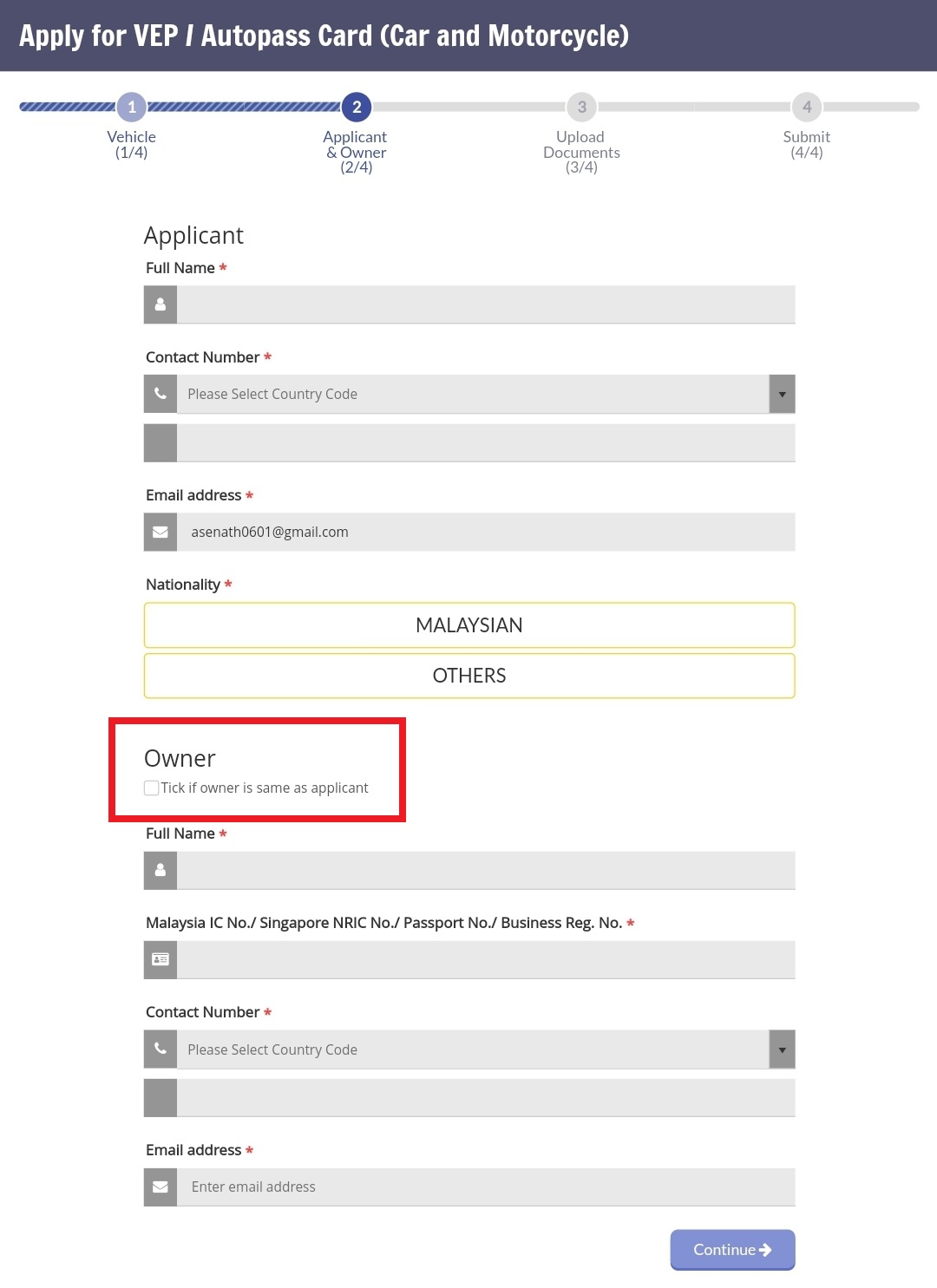 ▼ Step 3:填写司机和车主的个人资料。若司机和车主是同个人,可在“Tick if owner is same as applicant”旁边的小格子里打勾。