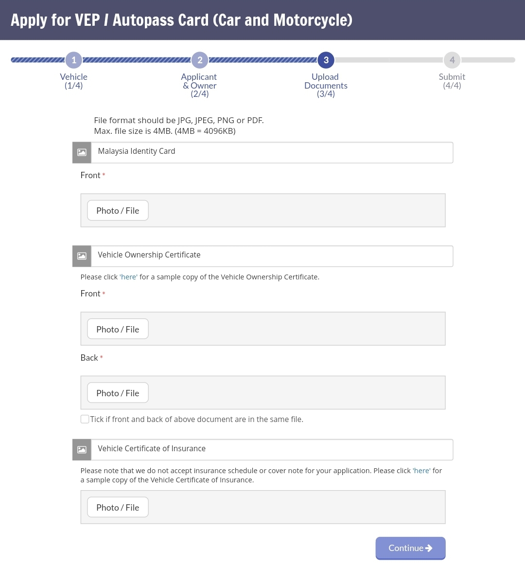 ▼ Step 4:上传(Upload)身份证、路税、车险等照片资料。最后点击“Continue”就申请完成啦!