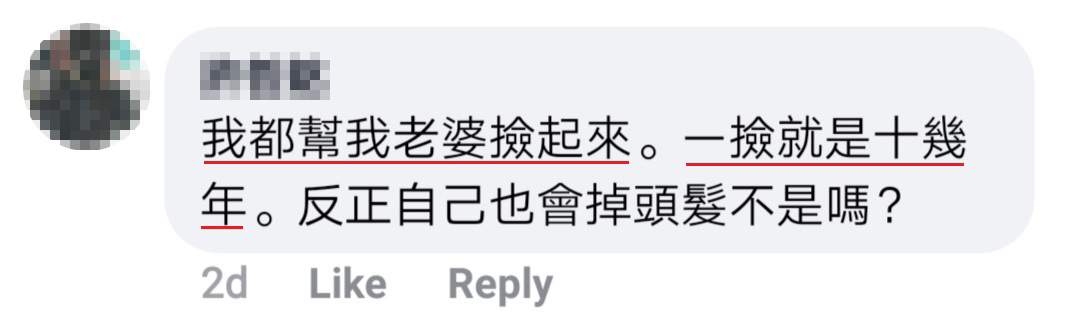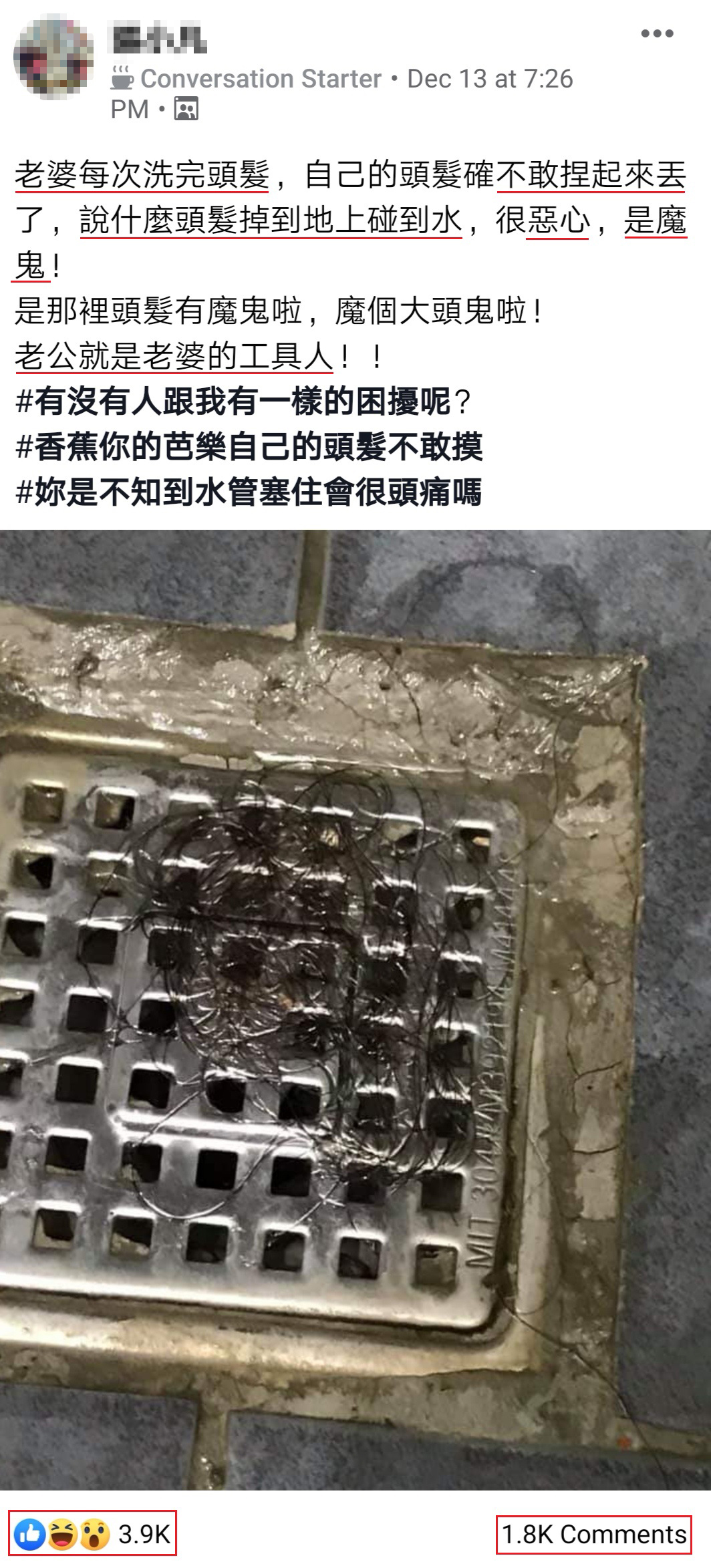 一名网友在《爆怨公社》的群组上抱怨妻子每次洗完头发都不敢自己捡起掉落的头发!因为其妻子认为这是一件很恶心的事!
