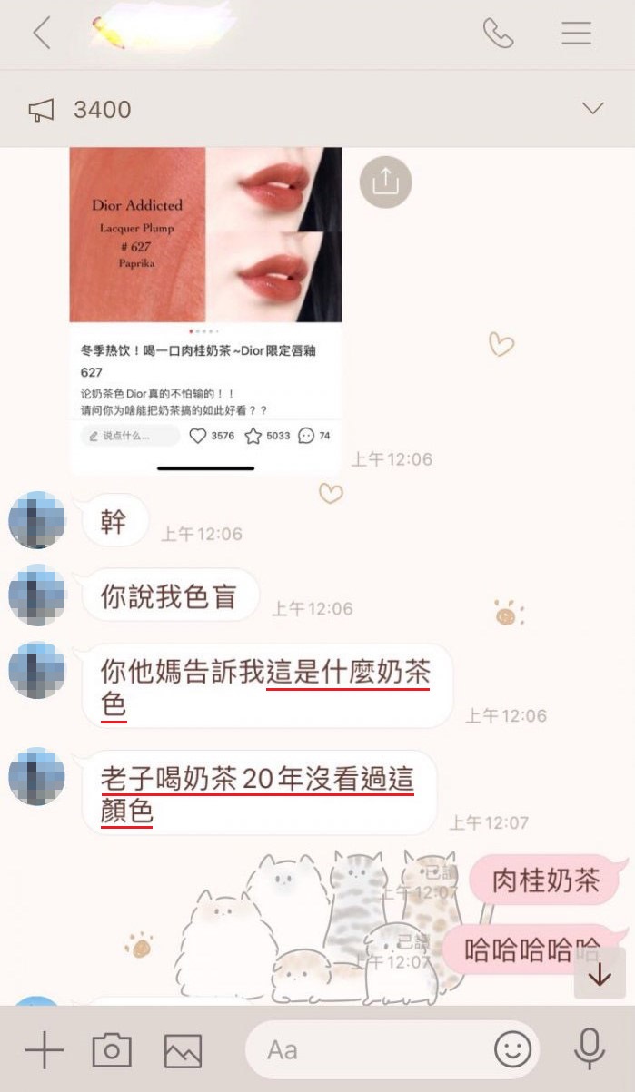 回家后,我们在Line上讨论,我就骂他色盲,他直接一个大爆气,就有了以下对话: