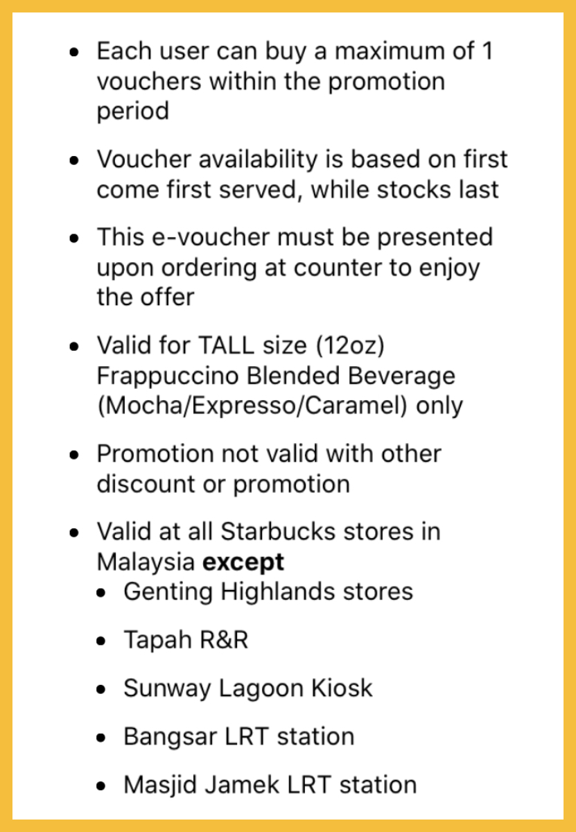 促销地点:全马 Starbucks 分行(除了 Genting Highlands stores,Tapah R&R,Sunway Lagoon Kiosk,Bangsar LRT Station 和 Masjid Jamek LRT station。)