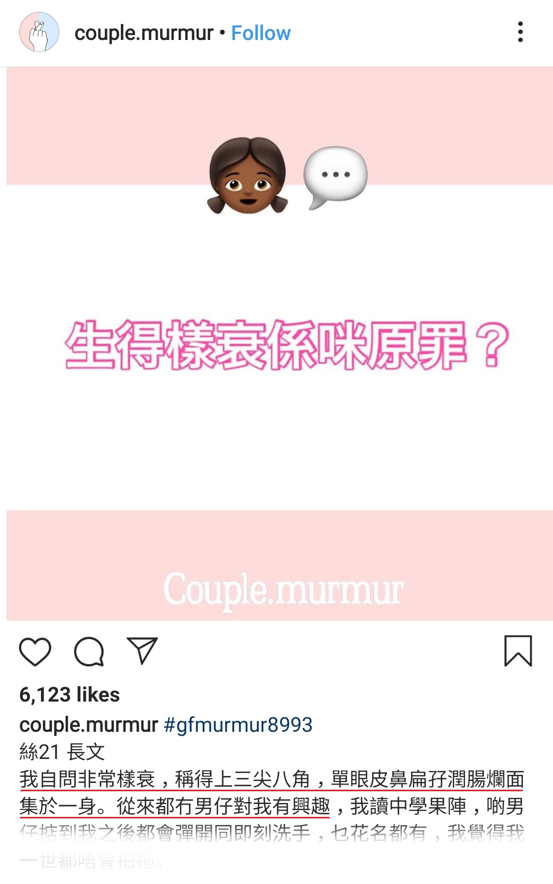 你是否认为:俊男美女才是天生一对?!近日,一名女网友在 Couple Murmur 的 Instagram 粉丝专页投稿,说道自己的长相“太幽默”,男友却是男神级,因此让她感到非常自卑!
