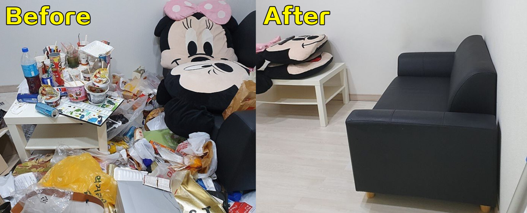 经过7个小时之后,钟点工人成功把垃圾屋还原啦!一起来看看前后对比图吧!