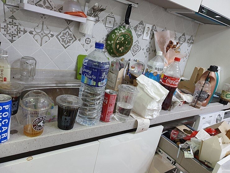▼ 厨房还放着喝剩的饮料及一些空瓶子