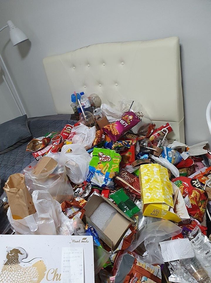 ▼ 卧室的床旁边到处都是零食袋及喝剩的饮料