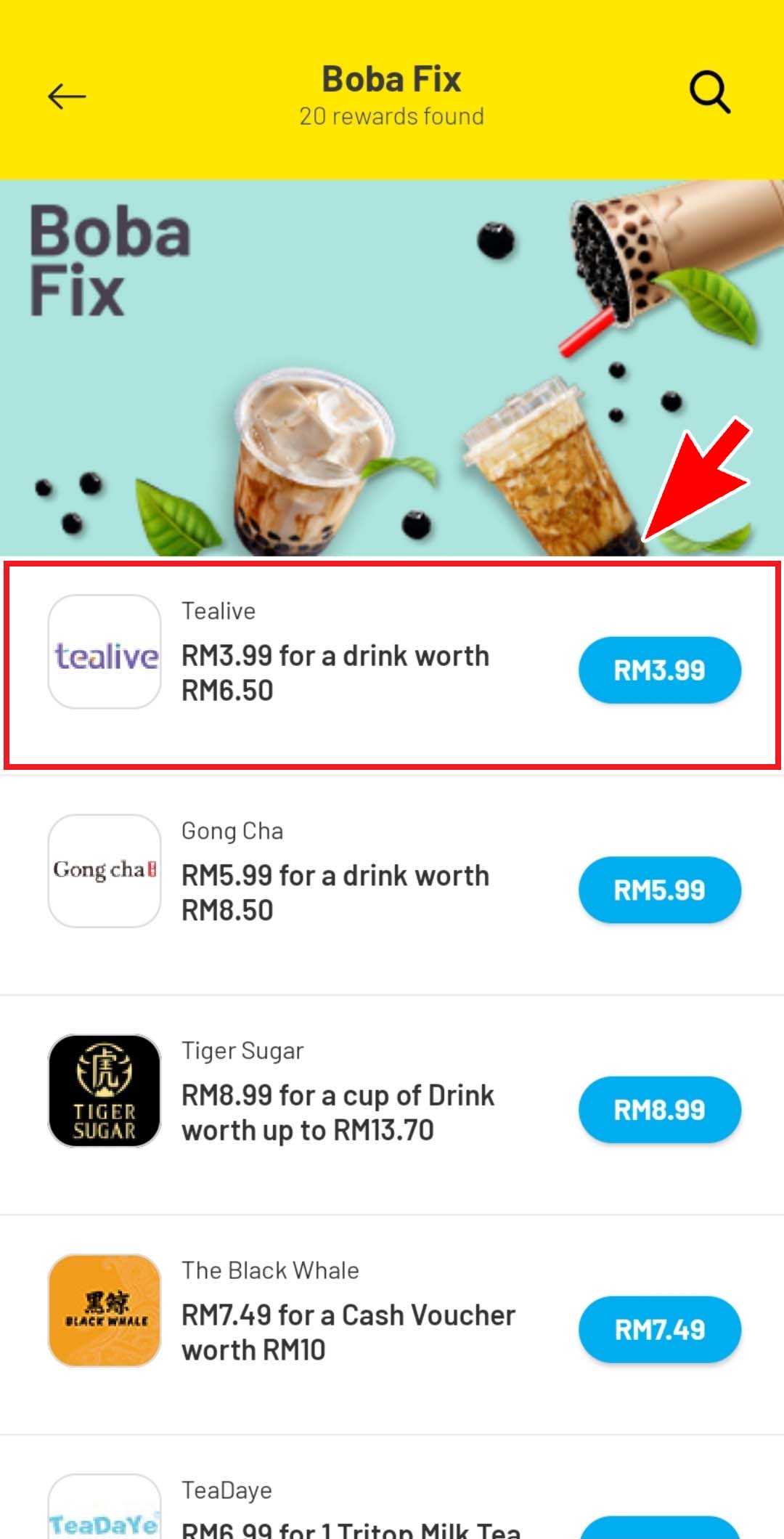 ▼ Step 3:选择你所要用的礼券(例如:Tealive。),在店内点餐时才点击。