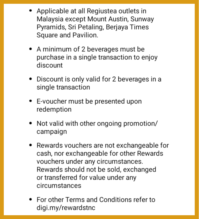 促销地点:全马 RegiusTea 分行(除了 Mount Austin,Sunway Pyramids,Sri Petaling,Berjaya Times Square 和 Pavilion.)