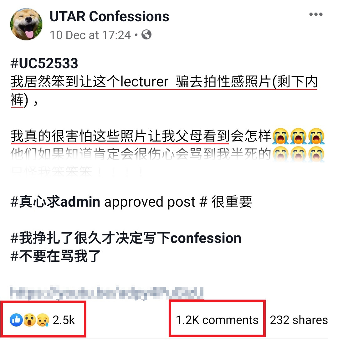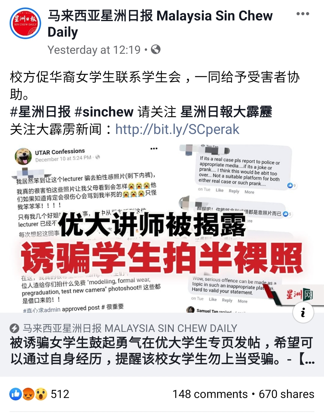 大马校园竟传出,大学女学生被男讲师诱骗,拍下半裸的性感照片!女学生近日通过 UTAR Confessions 面子书公开这件事,提醒其他女同学不要成为下一个受害者!