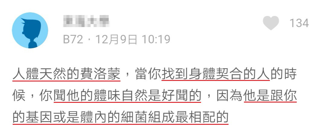 ▼ 有网友分析出:其实是人体天然的“费洛蒙”所导致的因素!当你找到身体契合的人就会感觉到对方的体味是好闻的!因为他是跟你的基因或体内的细菌组成最相配的!