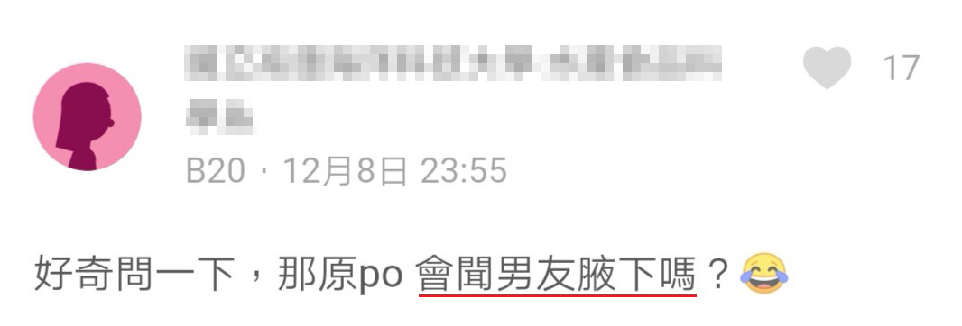 ▼ 不过,有网友好奇帖主是否会闻男友的腋下?!