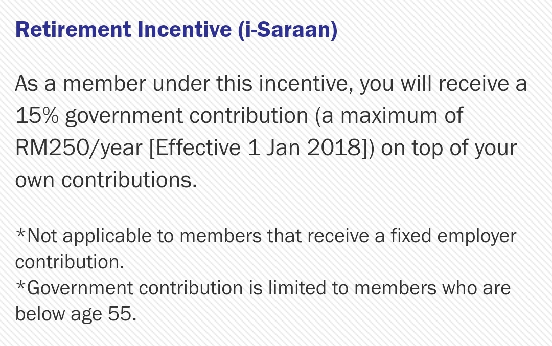 值得注意的是:i-Saraan可获得政府捐助15%的补助金(全年最高可获得RM250)!然而,EPF Self-Contribution 则无法享有这项补贴优惠!