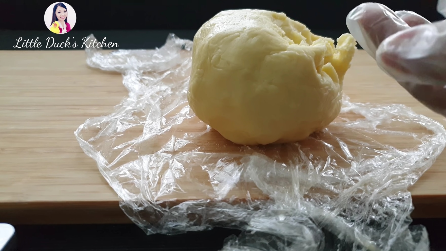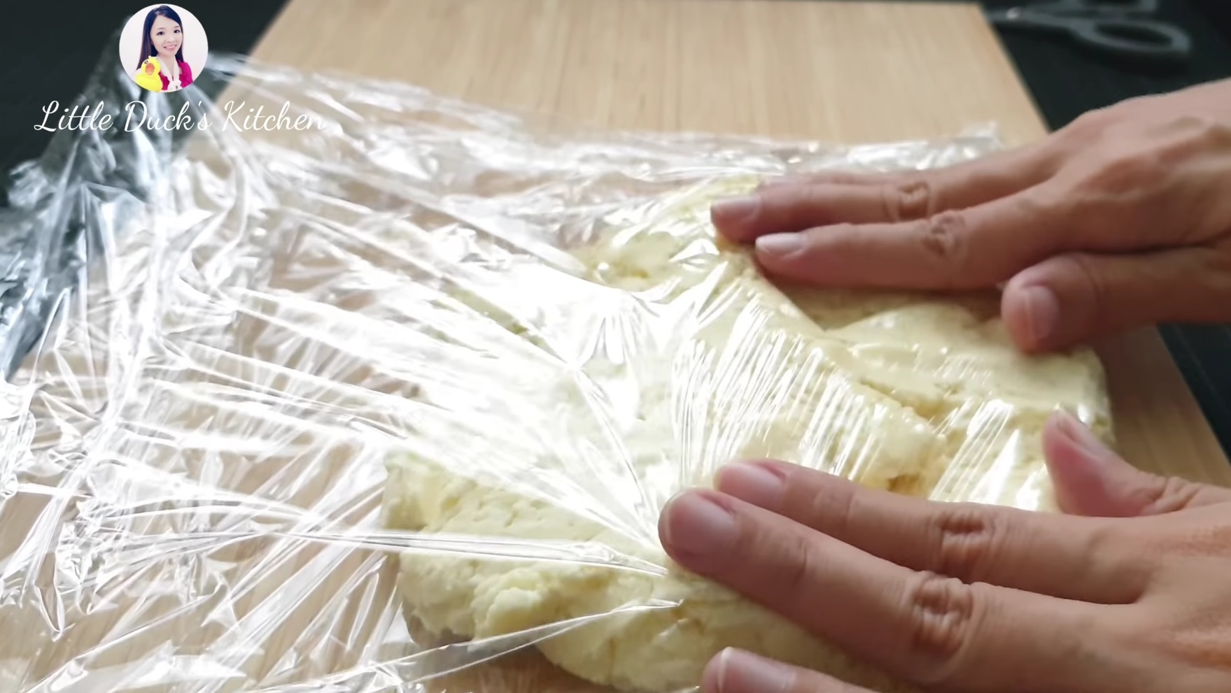 ▼ ⑨ 接着,使用保鲜膜把粉团包起来(边包边按扁粉团)