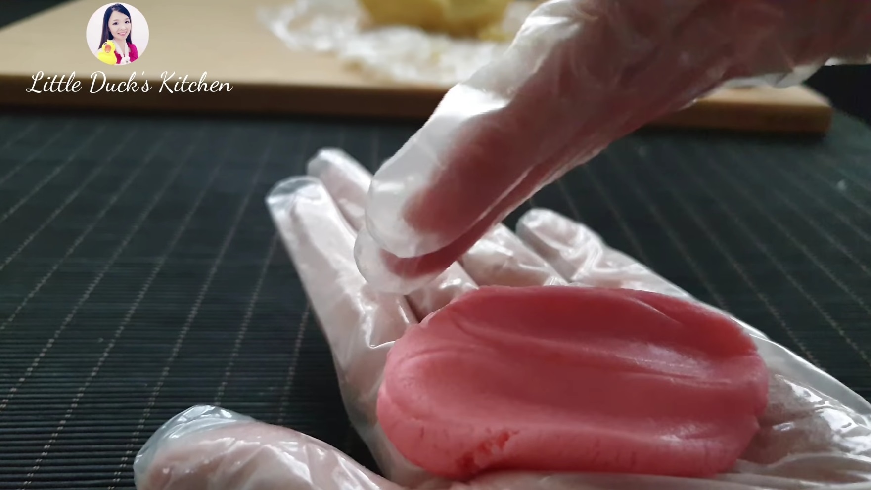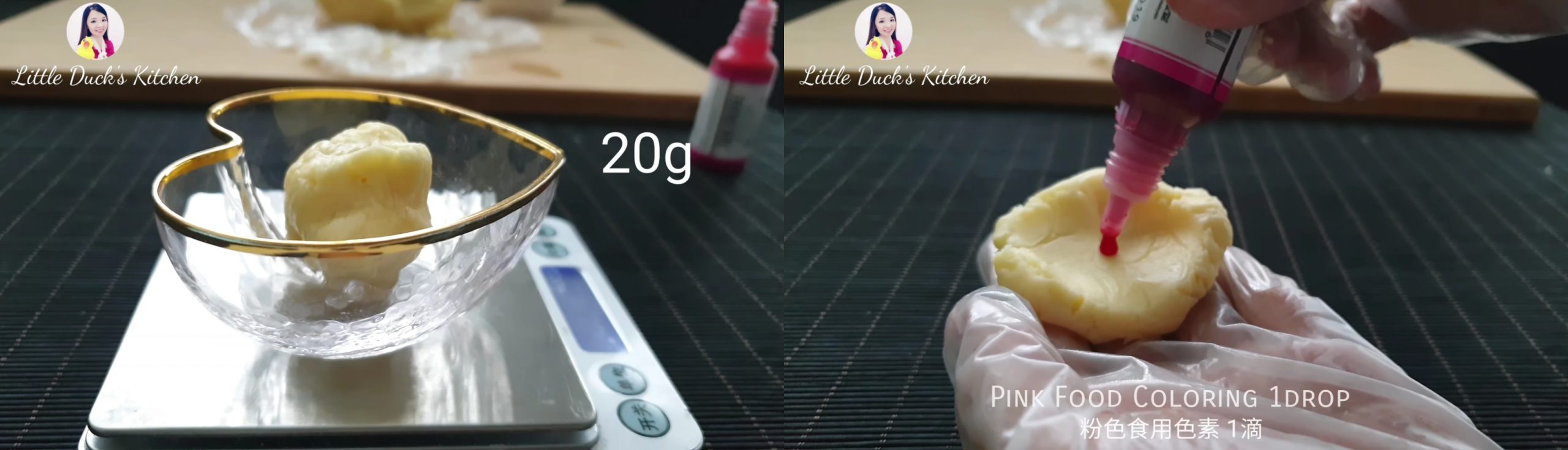▼ ⑭ 接着,从大粉团中捏出20g的粉团。使用粉色食用素点在20g粉团的中央