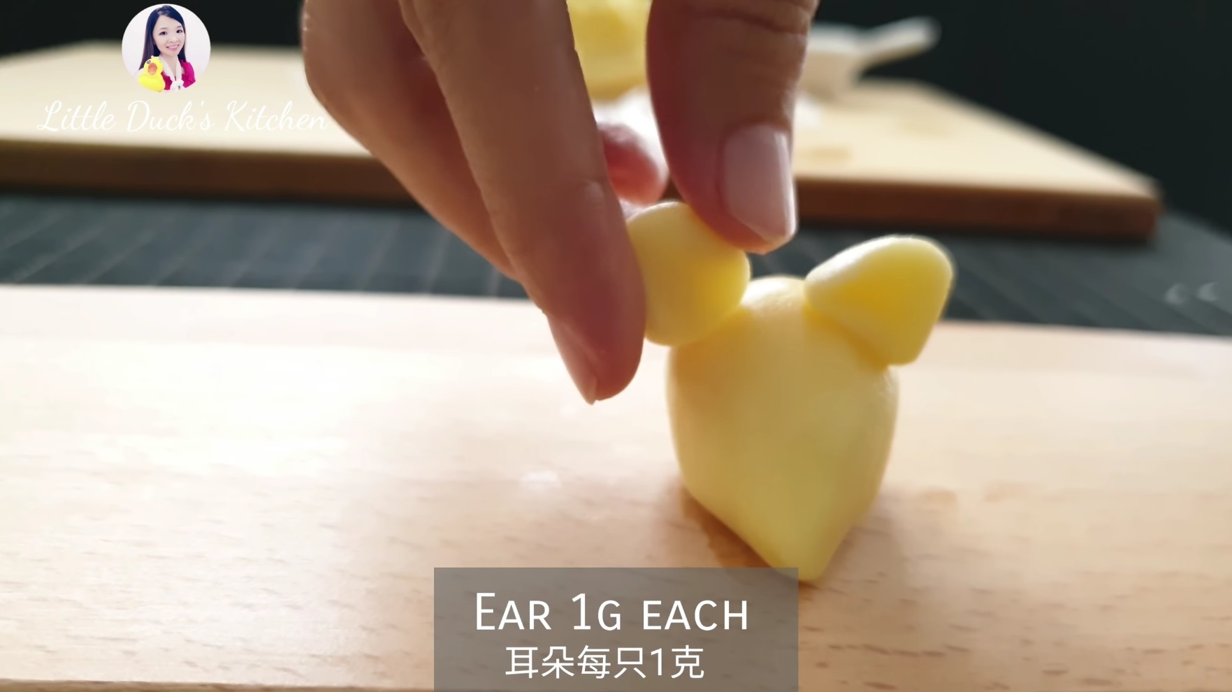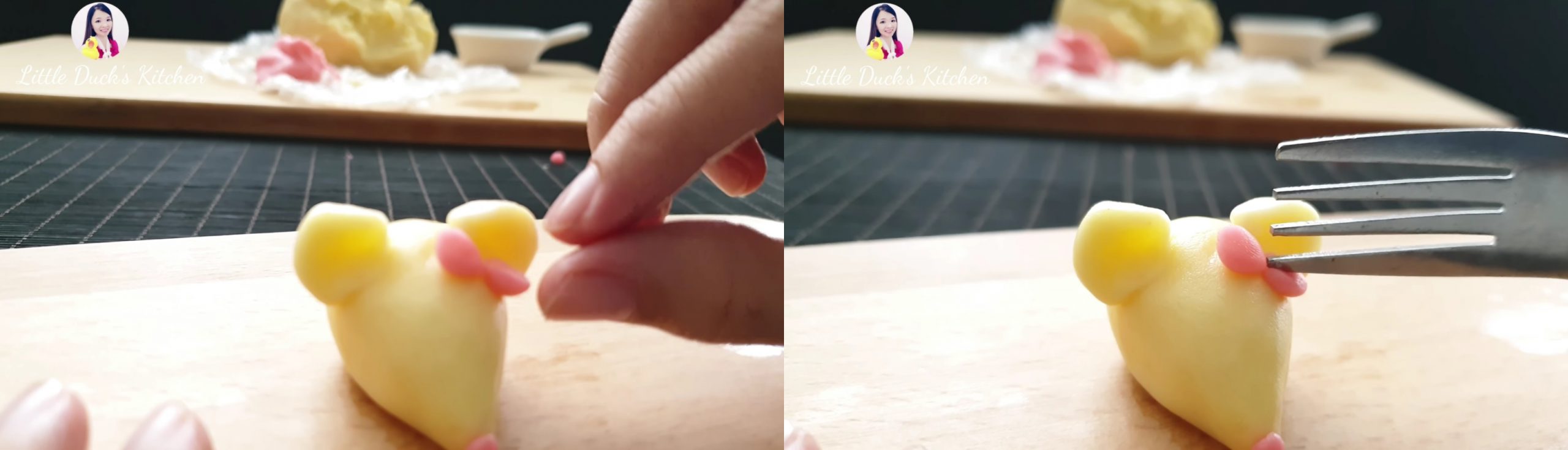 ▼ ⑯ 要注意咯~现在开始装饰老鼠的造型了!在老鼠粉团的身体上沾各1g的耳朵