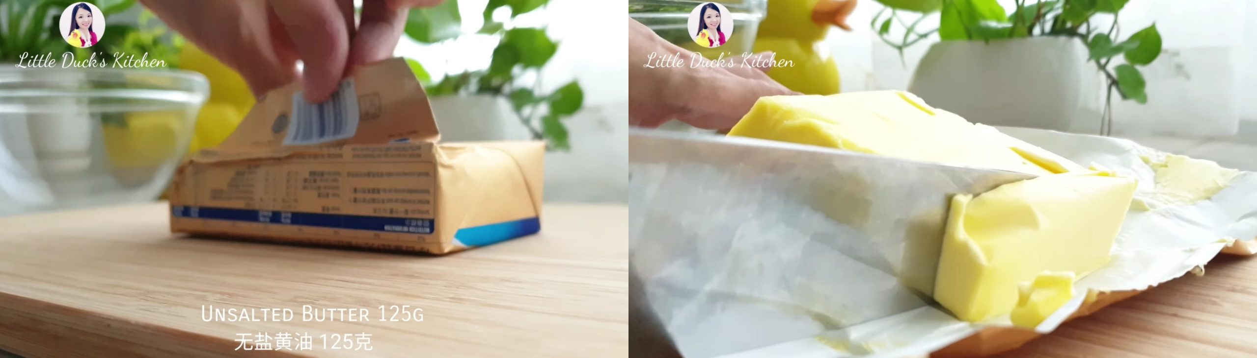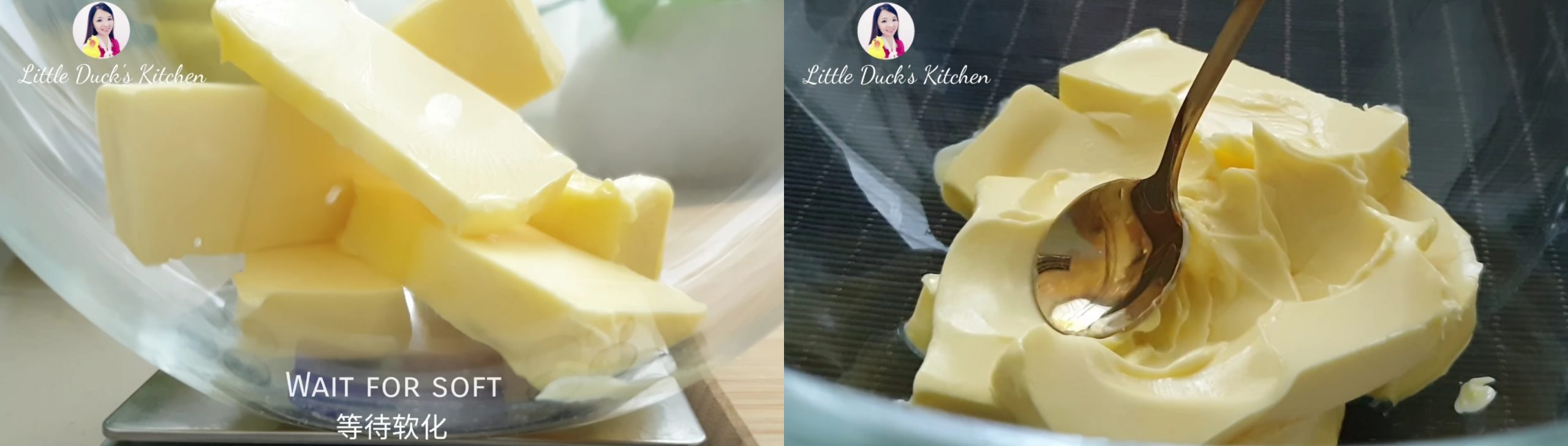 ▼ ② 把黄油装在容器内后等待软化,并使用汤匙按压黄油
