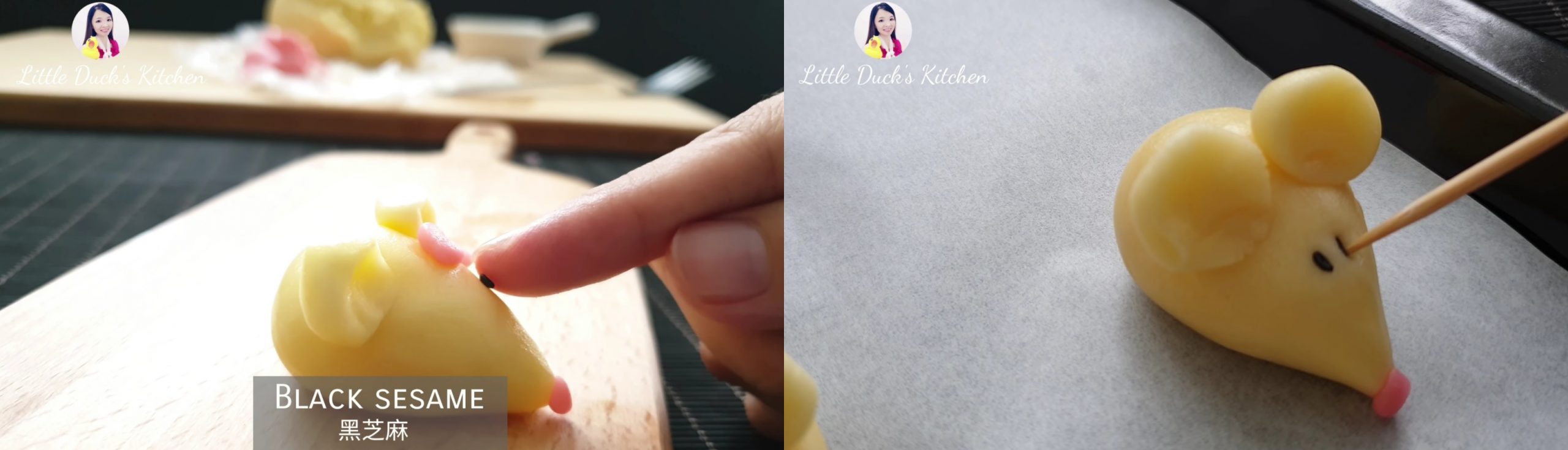 ▼ ⑲ 再使用黑芝麻装饰成老鼠的眼睛(或者你可以使用牙签把黑芝麻点在老鼠的身上哦)