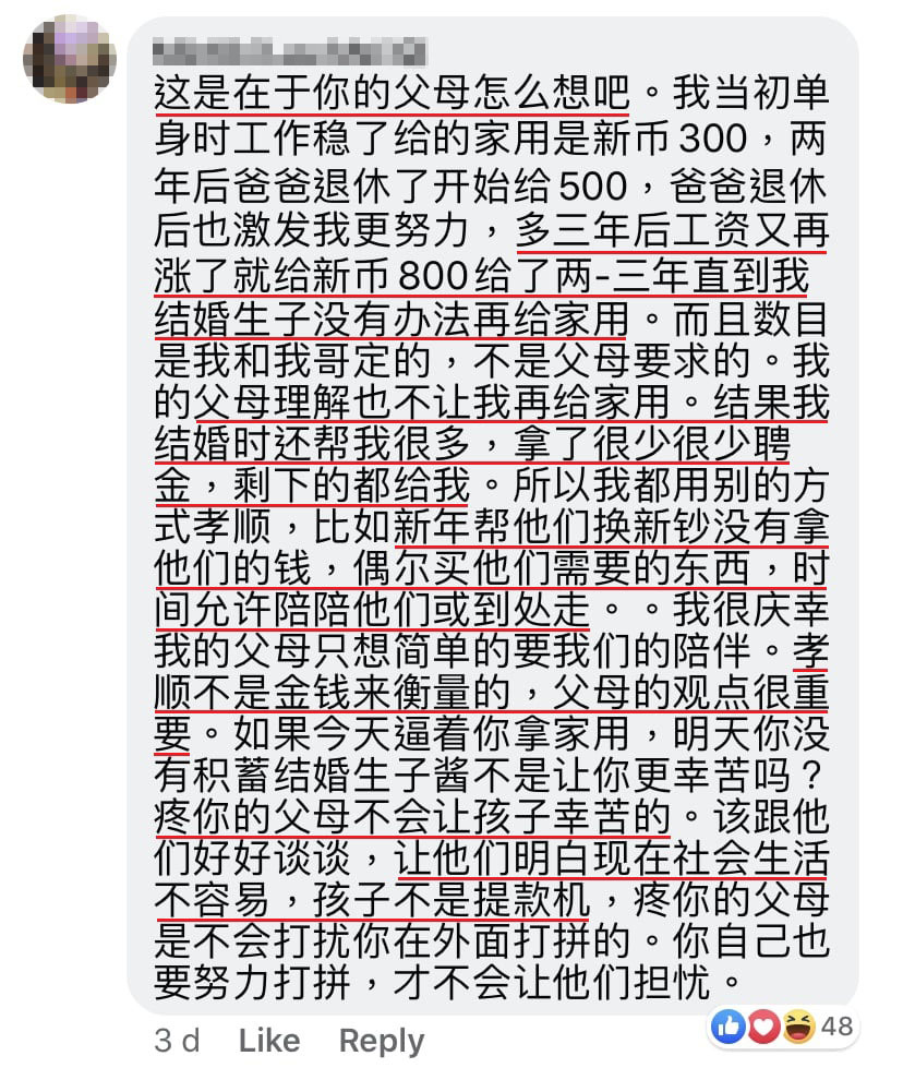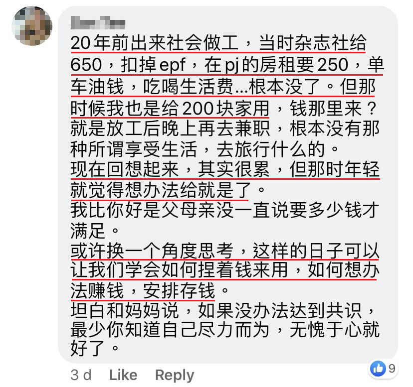 可我妈当时就直接和我说了:「你是时候给我钱了.」硬生生和我要求每月RM200(对,看到这里有些人可能会觉得很少,可是你试试在KL生活,薪资不到RM1,500,自住自养还得给家用。。。自己生活都成问题了。)