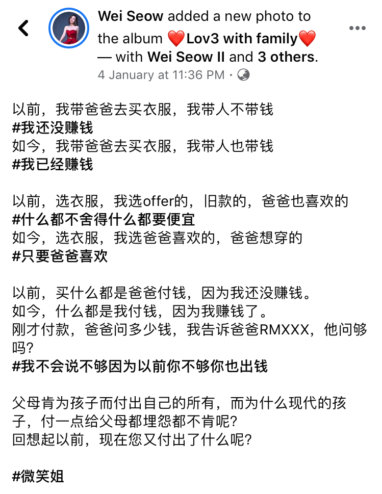 ▼“微笑姐”的这个帖文也让有些网友想起以前给爸爸买新衣服的情景!