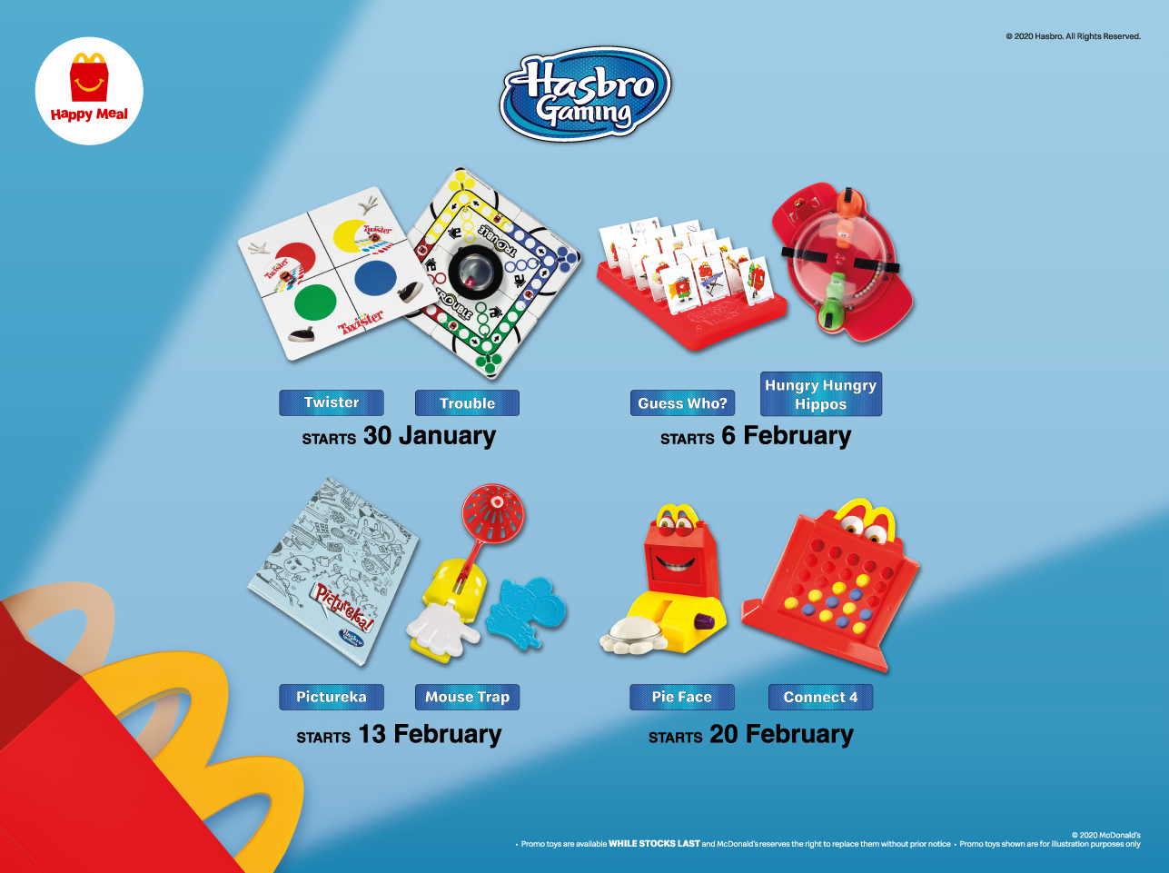 只要购买任何一份Happy Meal套餐即可获取这些Hasbro Gaming系列的玩具!而且将会送出8款Hasbro Gaming系列的玩具哦!