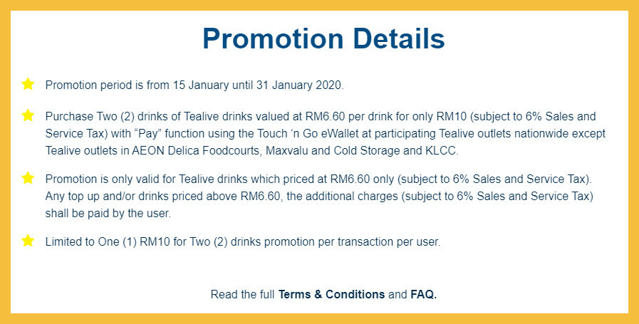 - 此优惠适合用于原价RM6.60的Tealive饮料(需缴付销售和服务税)