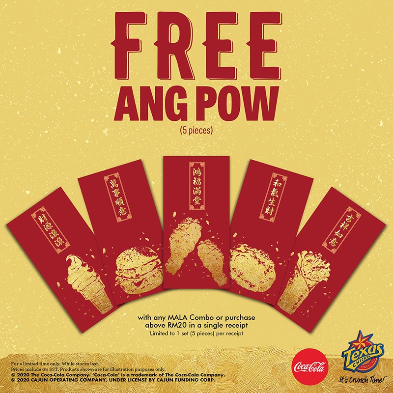 而且只要你购买Mala Chicken Combo 或消费RM20或以上(单张收据)就可以免费获得Texas送出的限量版红包封啦!共有5中款式哟!