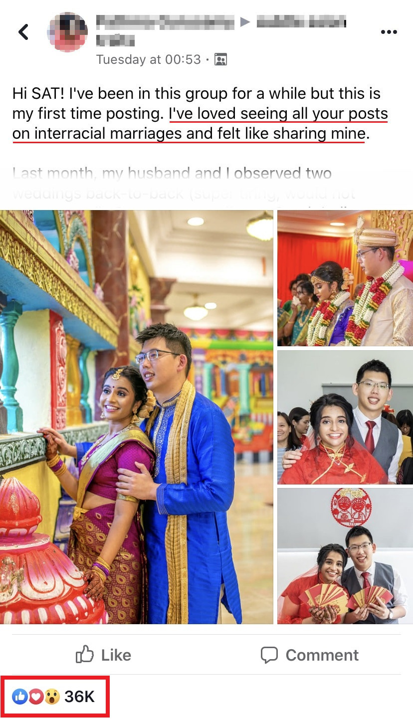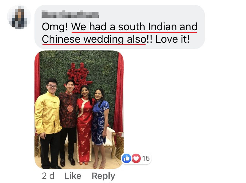 近日,一名大马的印裔女子在面子书分享她和来自新加坡的华裔丈夫的幸福婚礼,超过3万人感动按赞!