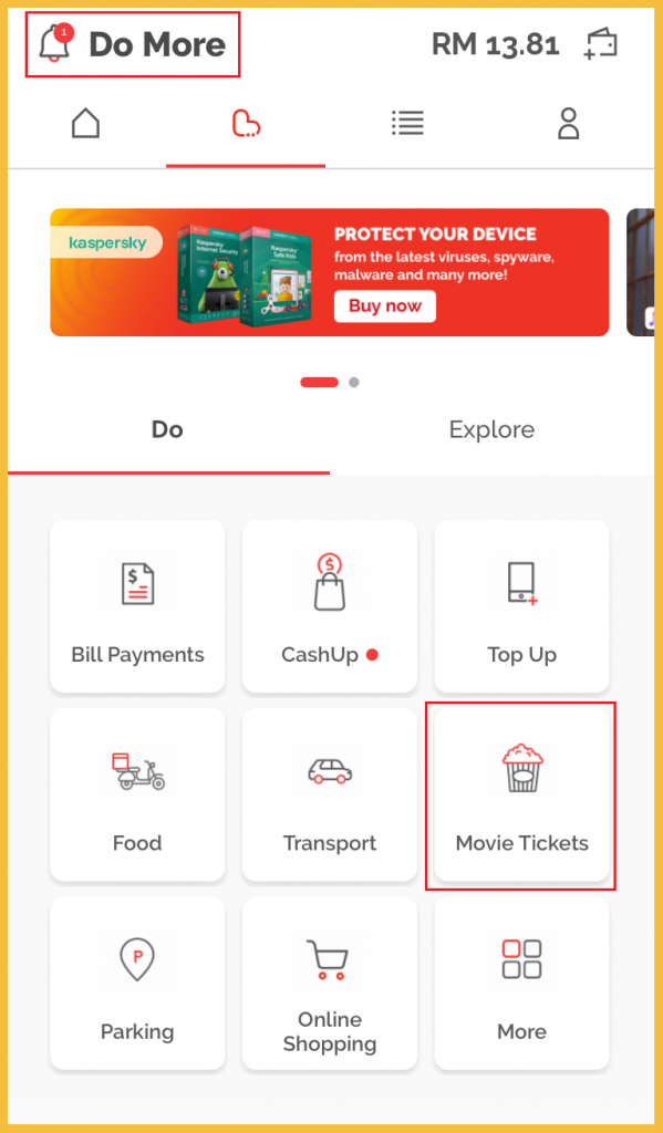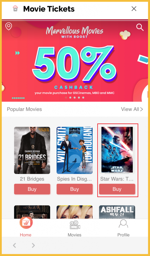 步骤1:打开你的Boost电子钱包,然后选择“Do More”后点击“Movie Ticket”