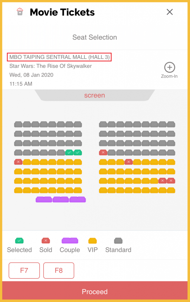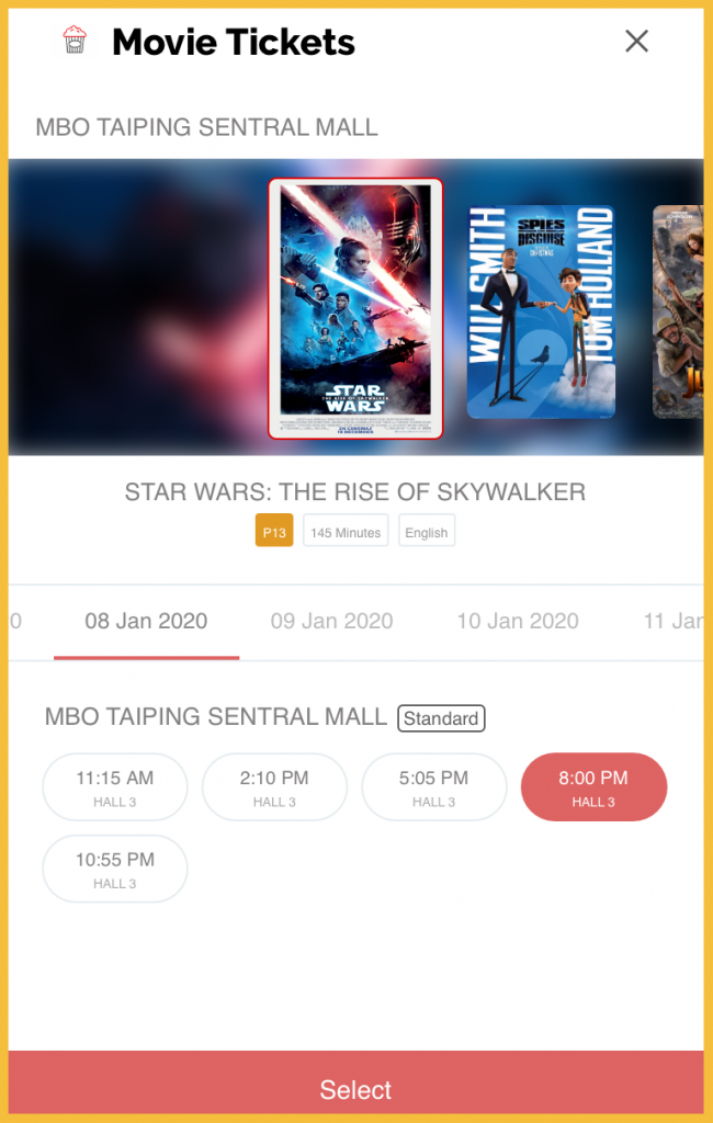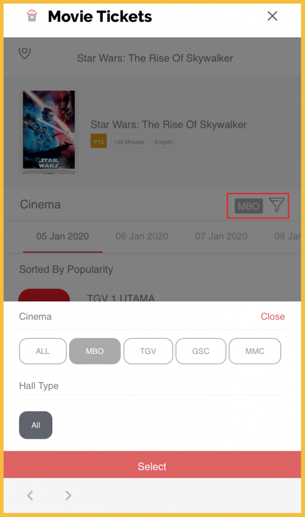 购买MMcineplexes & GSC的戏票与MBO是一样的步骤,但不同的是电影票的价格。