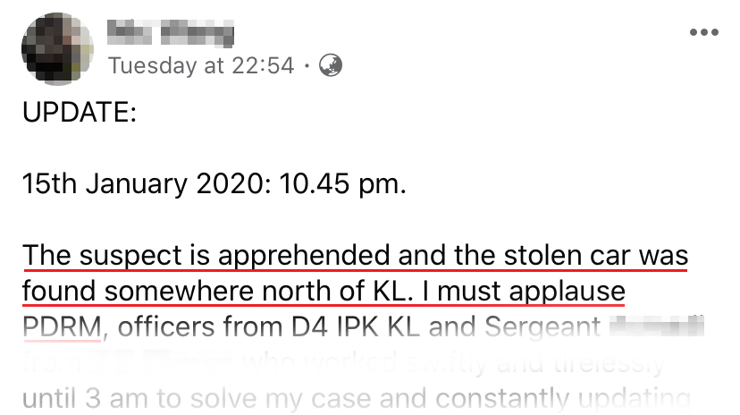 嫌疑犯被捕后,警方在吉隆坡的北部寻获我失窃的车。我要感谢 PDRM,因为他们一直不懈努力,直到了凌晨3点才解决我的案件,并不断向我通报有关情况。