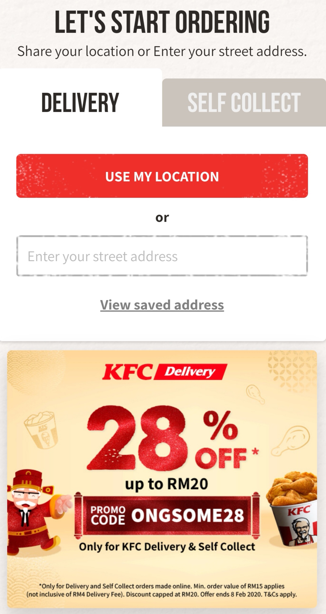 - 你可选择外送服务或自行到KFC分行去领取食物