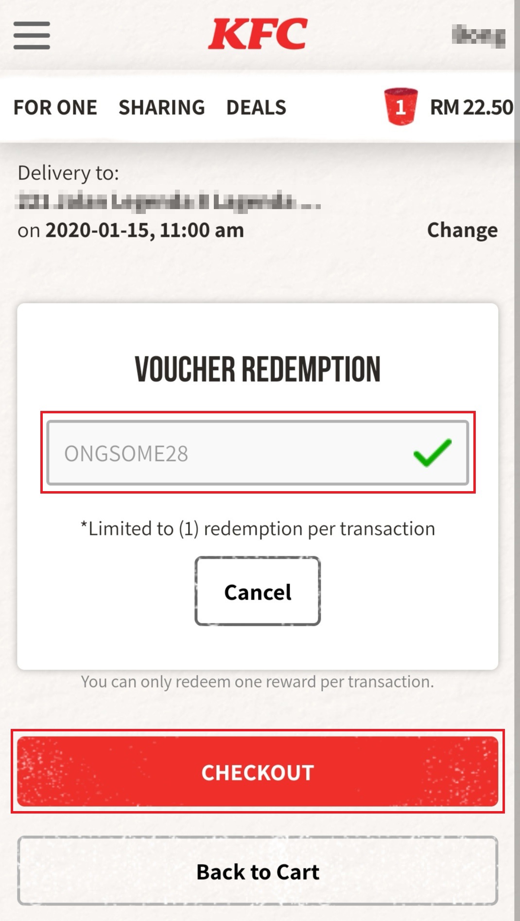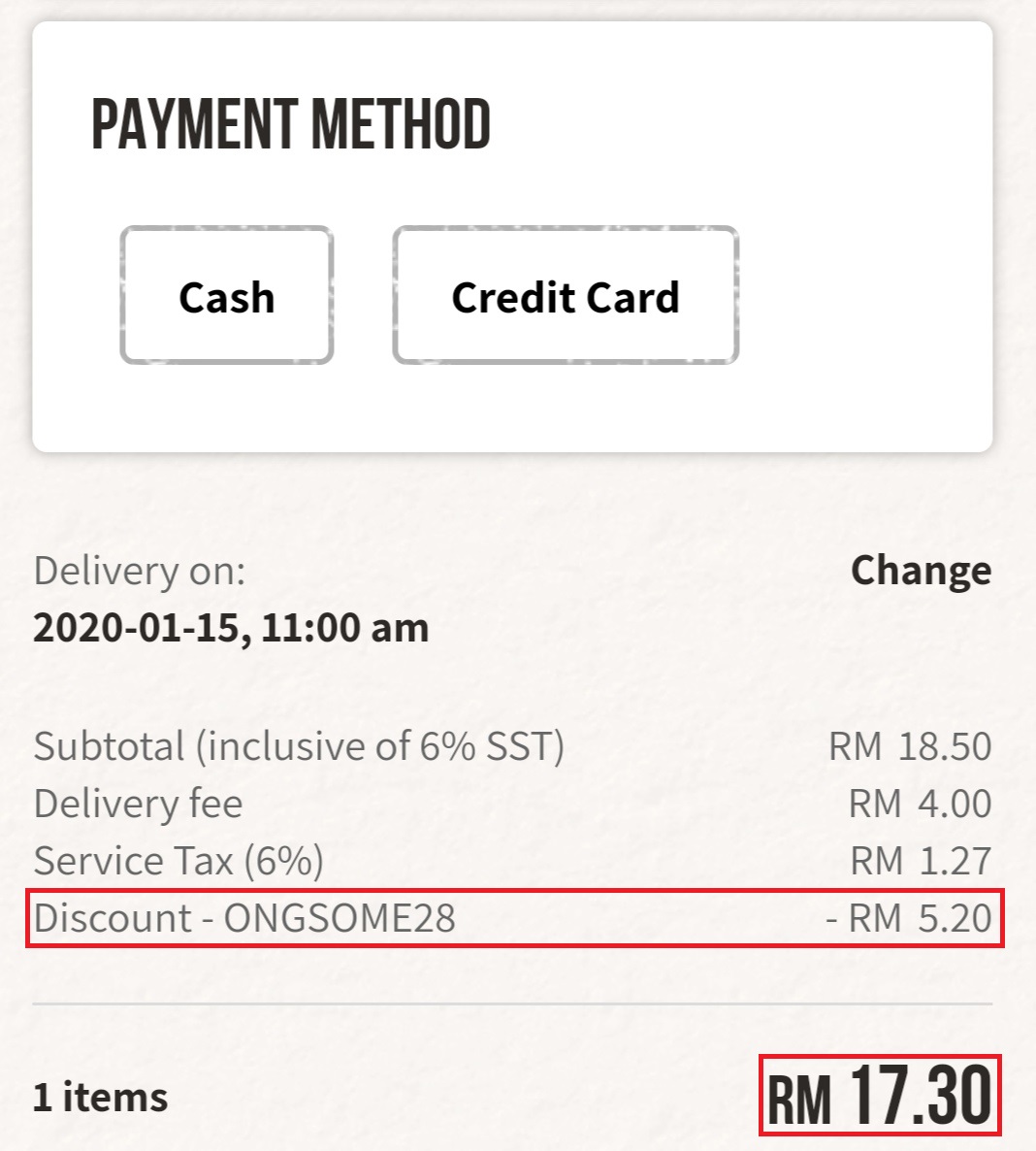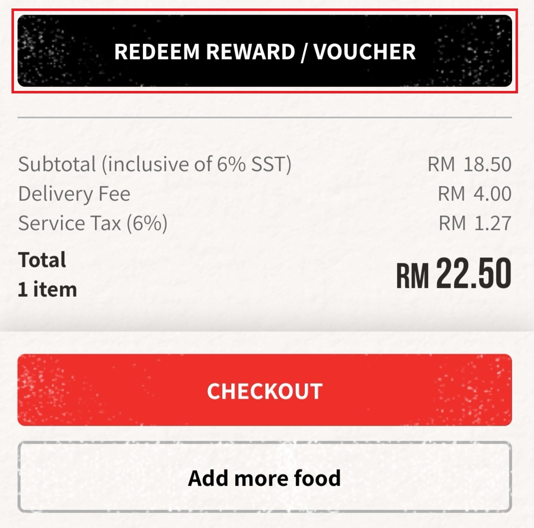 - 此优惠需要消费RM15或以上才能获得折扣(不包括RM4 外送服务费)