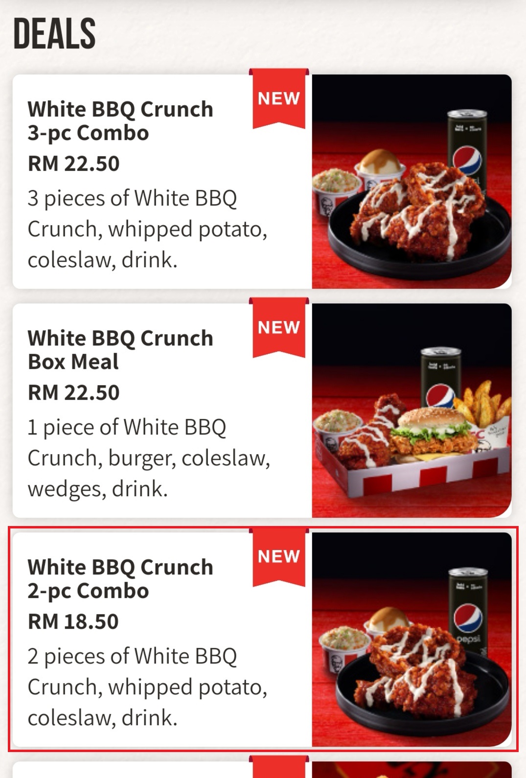 ※ 一份White BBQ Crunch 2-pc Combo 折扣28%后只需RM17.30(原价RM22.50)