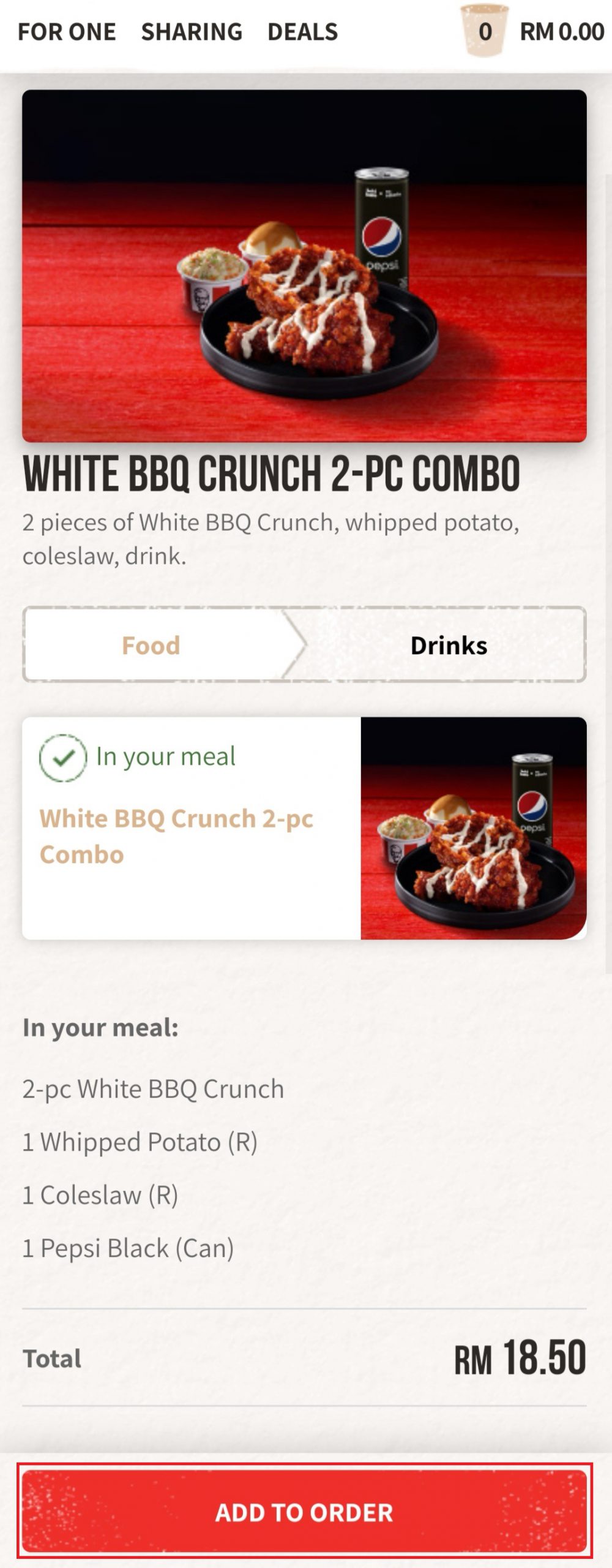 ▼ 步骤 2:选择餐点(需超过 RM15),比如:1份 White BBQ Crunch 2-pc Combo(原价 RM18.50)。