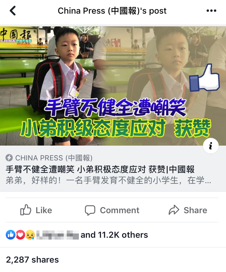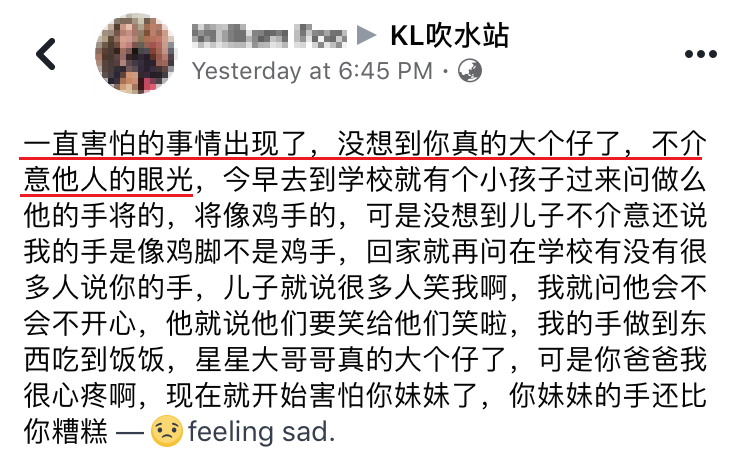 昨日,一名家长在KL吹水站分享了其手臂不健全的孩子到学校被同学嘲笑的经过!