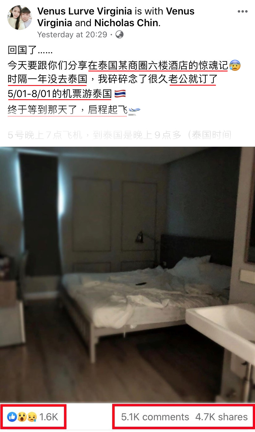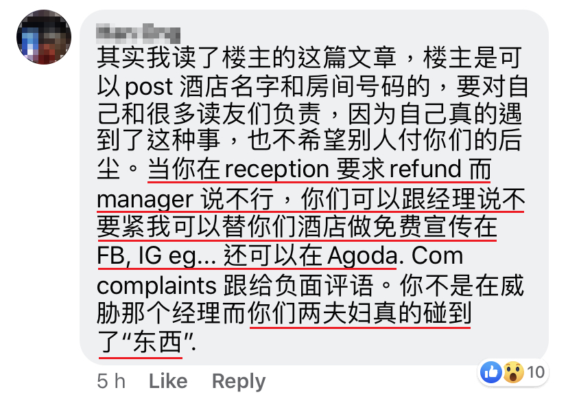 我跟他说:「去柜台看看有没有其他房间吧!」但是老公坚持要换,我就点头。当时泰国时间:3am(马来西亚时间:4am)。