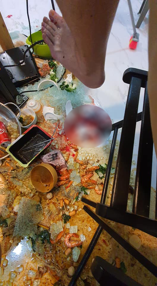 After the incident happened, all of us sat there in shock, and we couldn’t do anything as there were glass shards and hot soup everywhere. *please take a look at the picture to visualise the amount of damage done* we immediately called the ambulance and paramedics came down to rescue us. With all my guests injured, some with cuts bigger than the size of an eye. I myself was brought to NTF for treatment of 2nd degree burns.