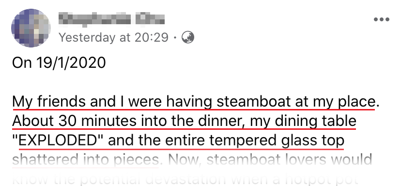 My friends and I were having steamboat at my place. About 30 minutes into the dinner, my dining table “EXPLODED” and the entire tempered glass top shattered into pieces. Now, steamboat lovers would know the potential devastation when a hotpot pot were to be toppled/spilled over. Now x10 of the damage because of the sudden shatter with glass flying everywhere.
