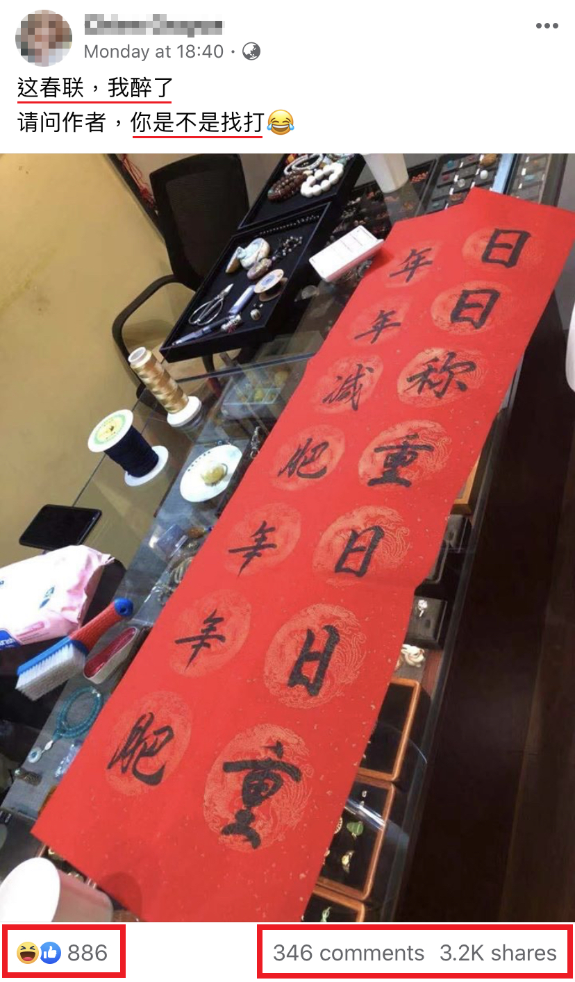 由于2020年的农历新年即将来到,近日一名大马网友在面子书分享一张照片,照片是一张非常“应景”的春联,原PO在帖文里写着:「这春联,我醉了!请问作者:你是不是找打?!」