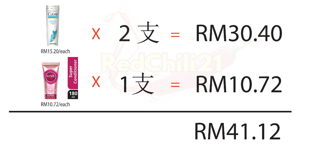 ▼ Clear 洗发液x2 + Sunsilk 护发素x1 = RM41.12(已经超过RM35指定消费数额)