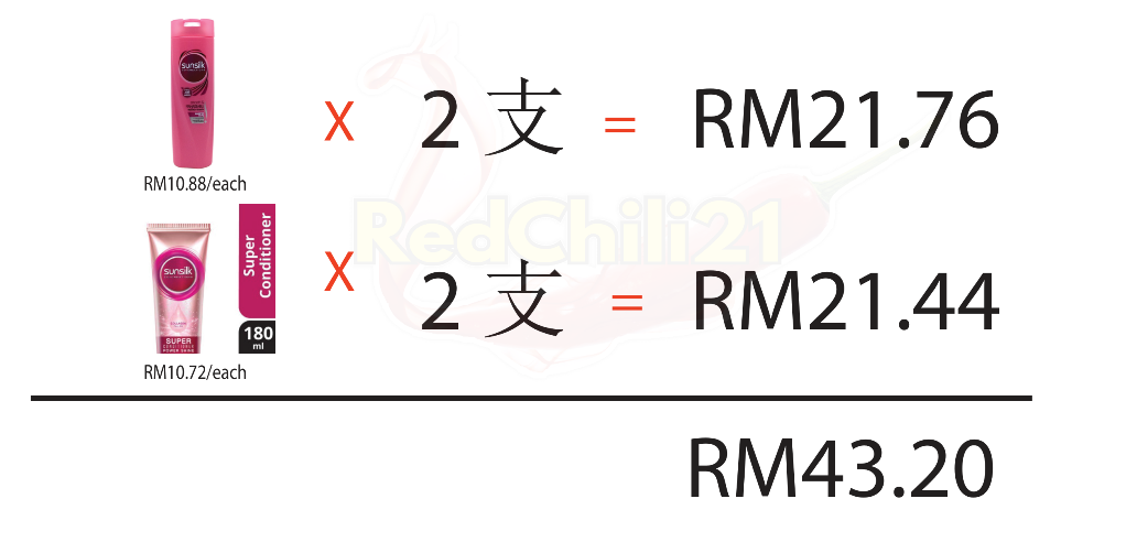 ▼ Sunsilk 洗发液x2 + Sunsilk护发素x2 = RM43.20(已经超过RM35指定消费数额)