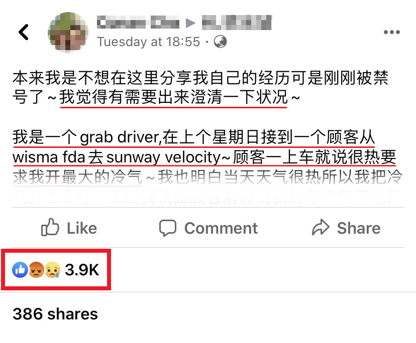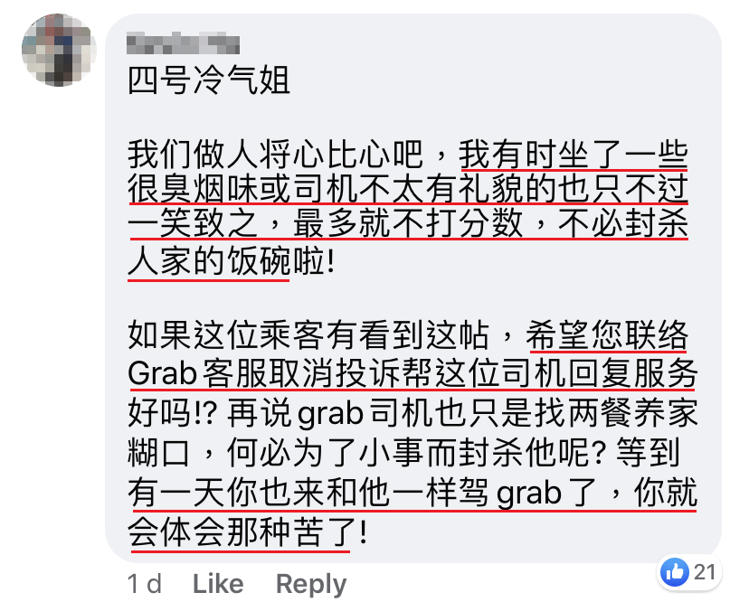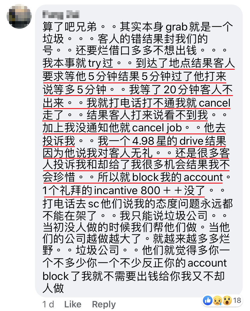 家家有本难念的经,各种行业都有辛酸的一面!近日一名大马 Grab 司机在面子书PO文,遇到一位蛮不讲理的顾客,因为她的一个投诉导致这名 Grab 司机遭禁号,好好的一份工作就这样突然没了!
