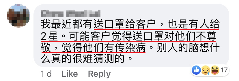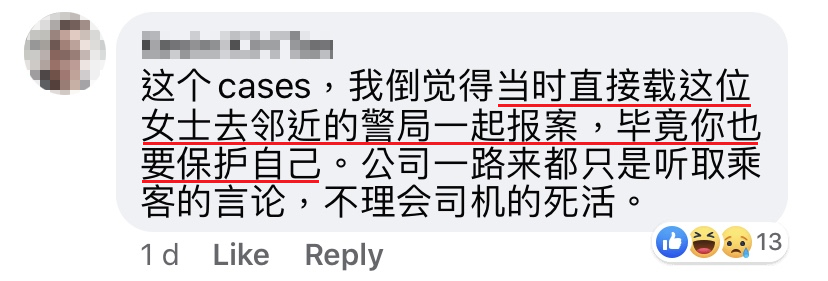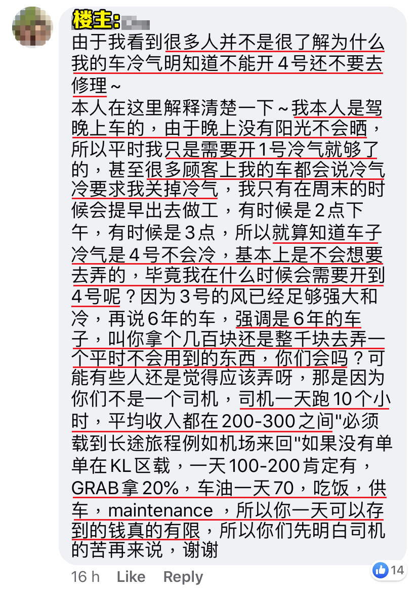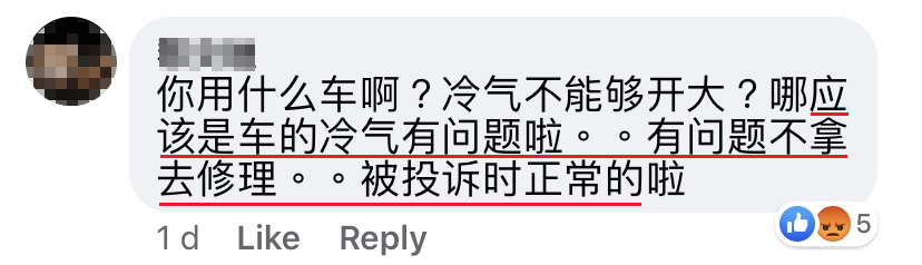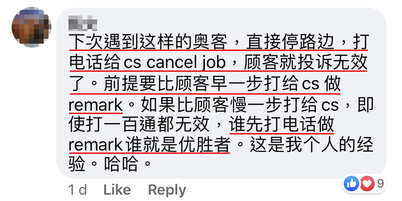 我就回应她说:「小姐,我现在只是载你去 Velocity。还有,我已经跟你说了,我的车冷气不能开4号。」可是顾客就是一直在投诉,说我无礼又吝啬的。