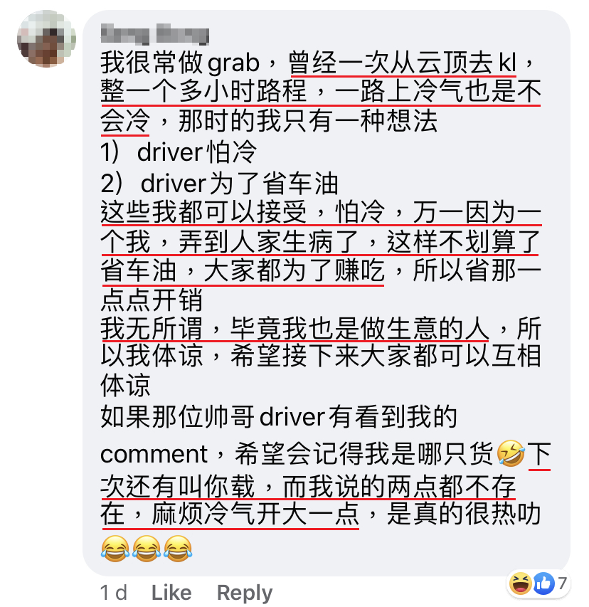 我就跟顾客说:「Miss,你自己感觉一下现在有没有冷?现在只是风而已。」然后顾客就说我吝啬,遇到我这种不舍得开冷气的司机,还要求我马上停车。