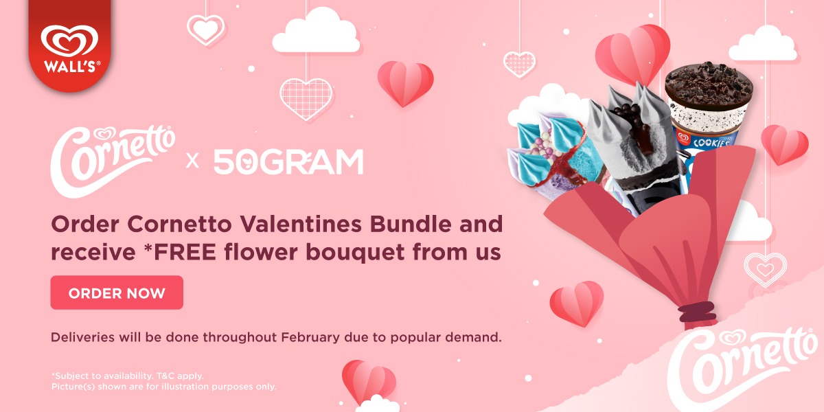 促销活动:购买 Wal’s 情人节 Cornetto 冰淇淋配套可免费获得花束(50gram)